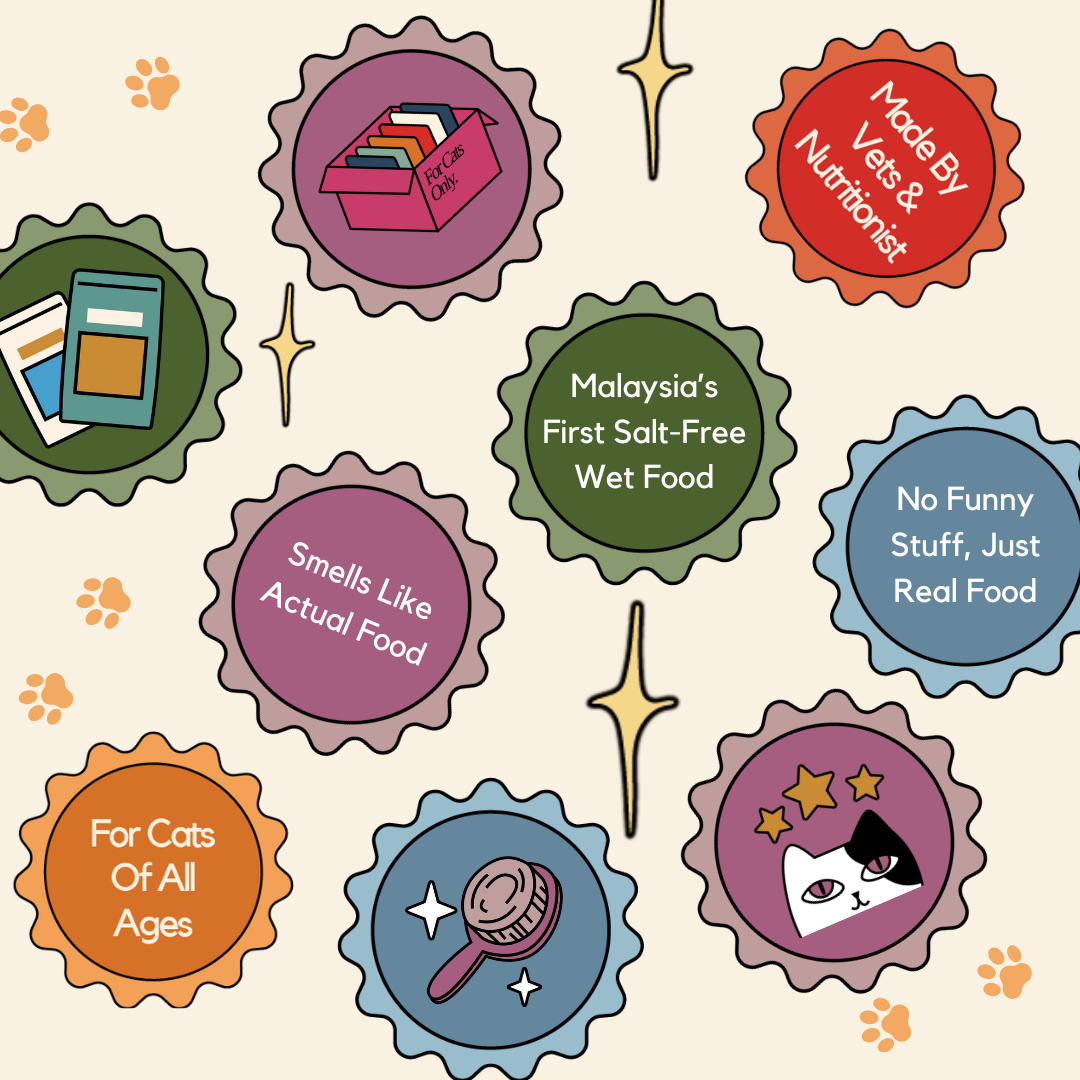 None at all — our recipe is 100% salt-free. In fact, it’s Malaysia’s first salt-free wet food made to keep your cat healthy without compromising on taste.