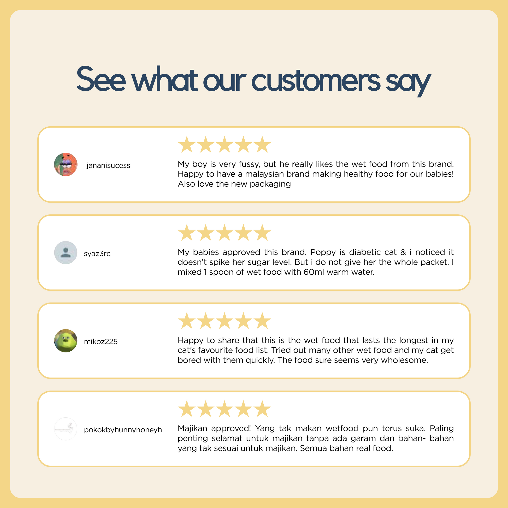 i rarely make reviews but i saw this brand on reddit when i was trying to search for better wet food alternatives for muffin. muffin really enjoys all the 4 varieties and thankfully showed no allergic reactions to any of them. i have to admit i was so suprised by how it smells. it didnt smell like the regular wet cat food and the transparency of the ingredients really sold me. youve earned a loyal customer!! as you can see muffin really enjoys the meal!!