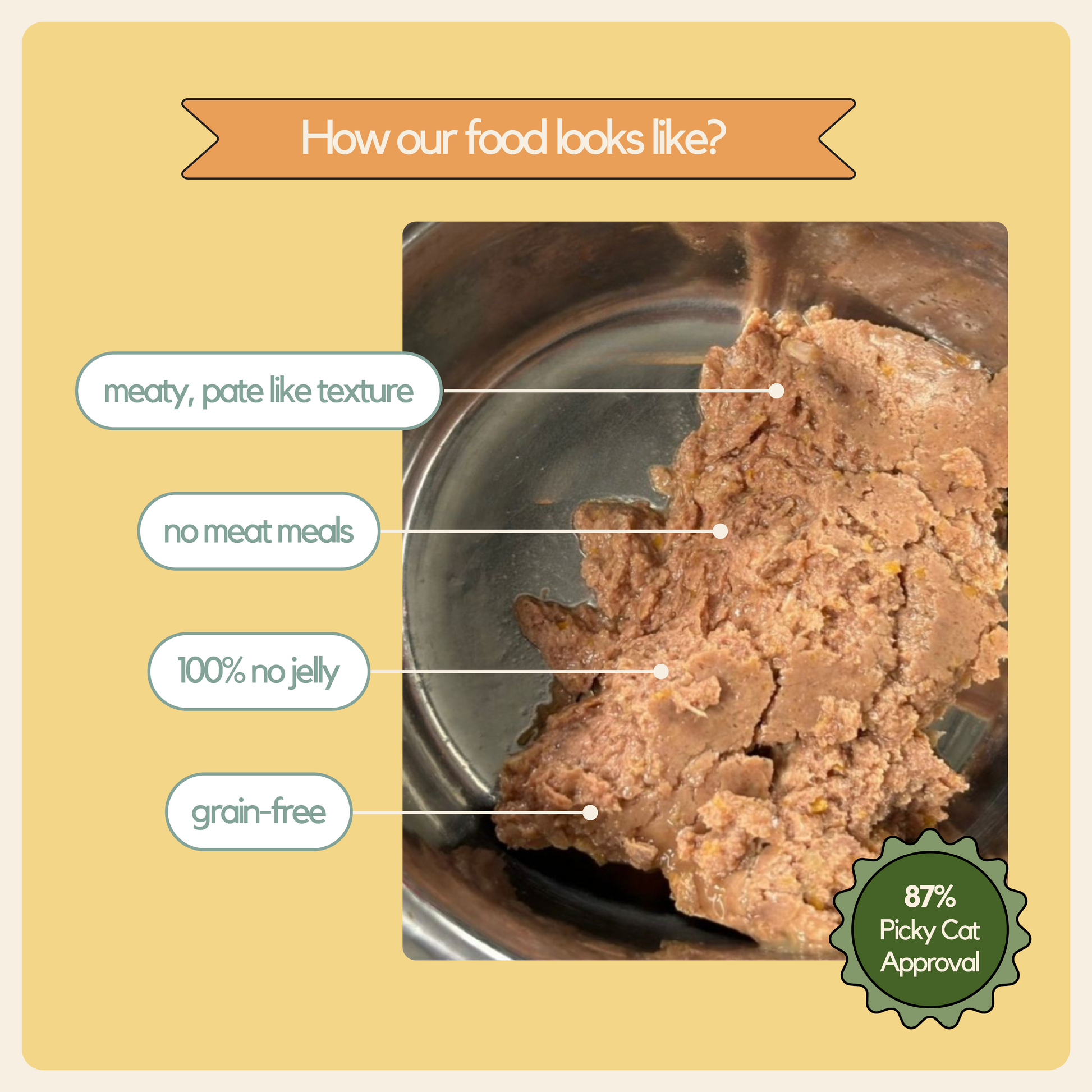 Our food has an even, pate-like texture. It is easy to eat and digest for cats of all ages. It’s partly why they always end up on the clean plate club!