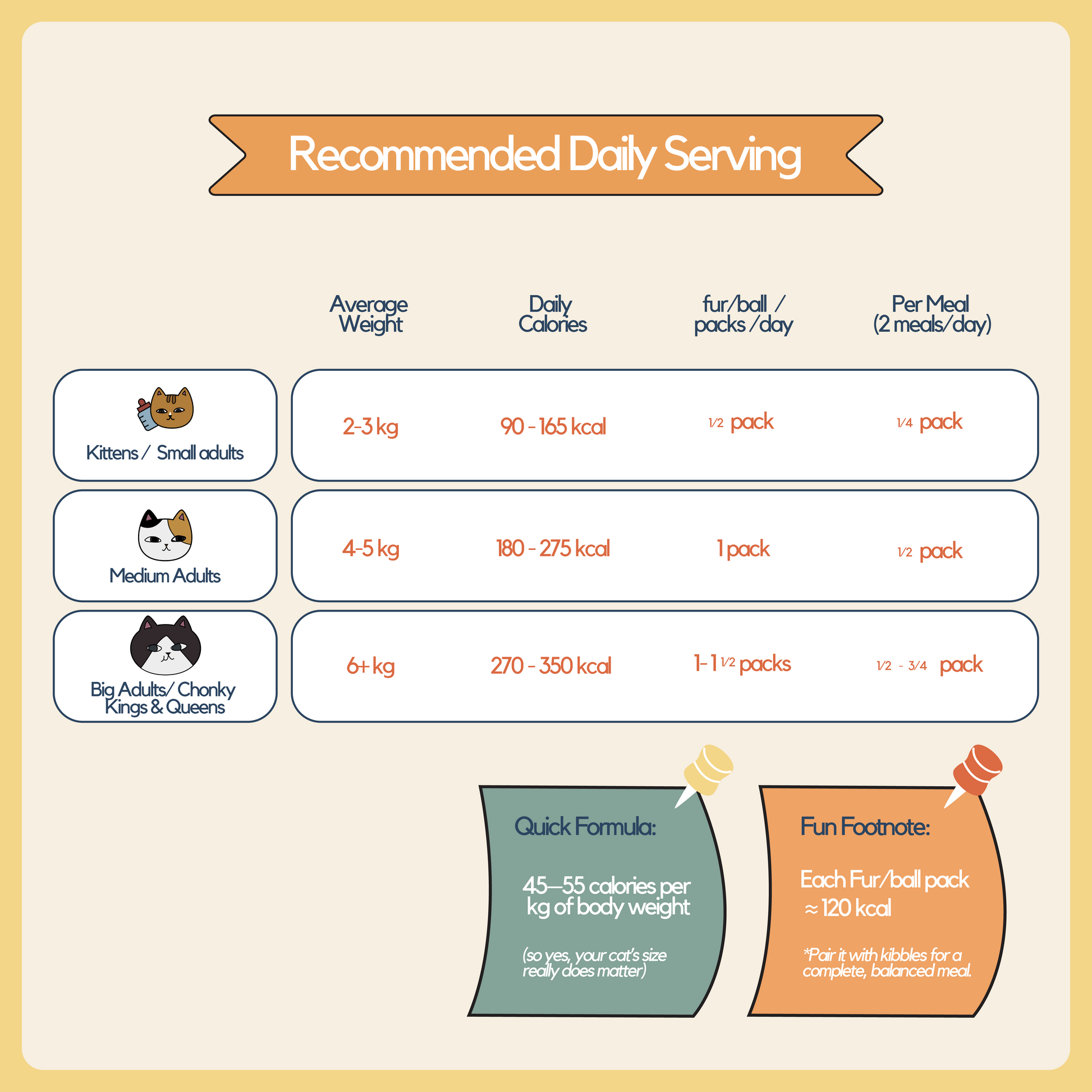 Feeding amount depends on cat size, feeding habits, activity level, age, and other factors. We make different recommendations based on each cat’s individual needs. One pack a meal usually suffice for most cats' needs.