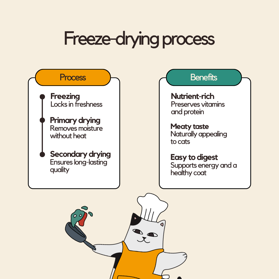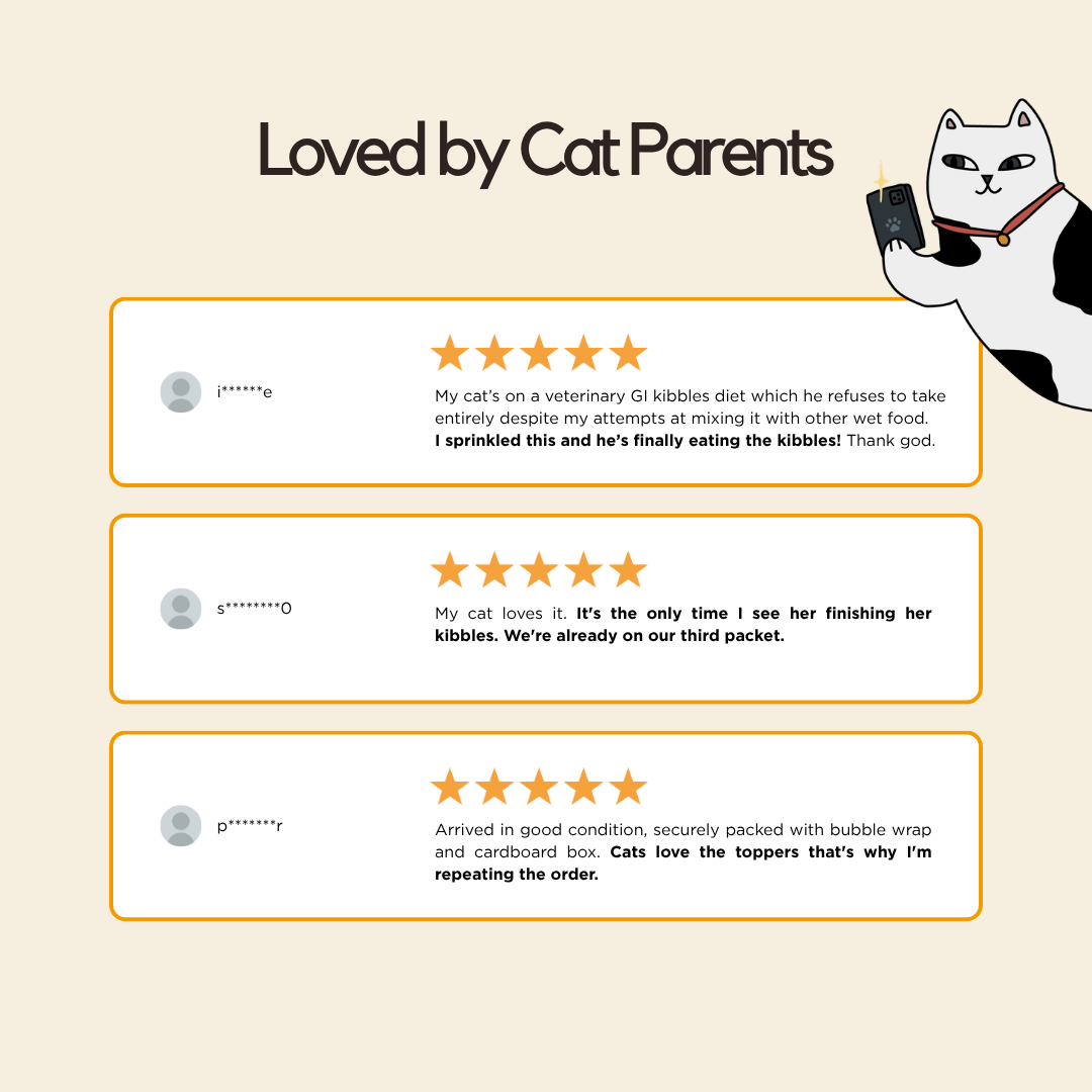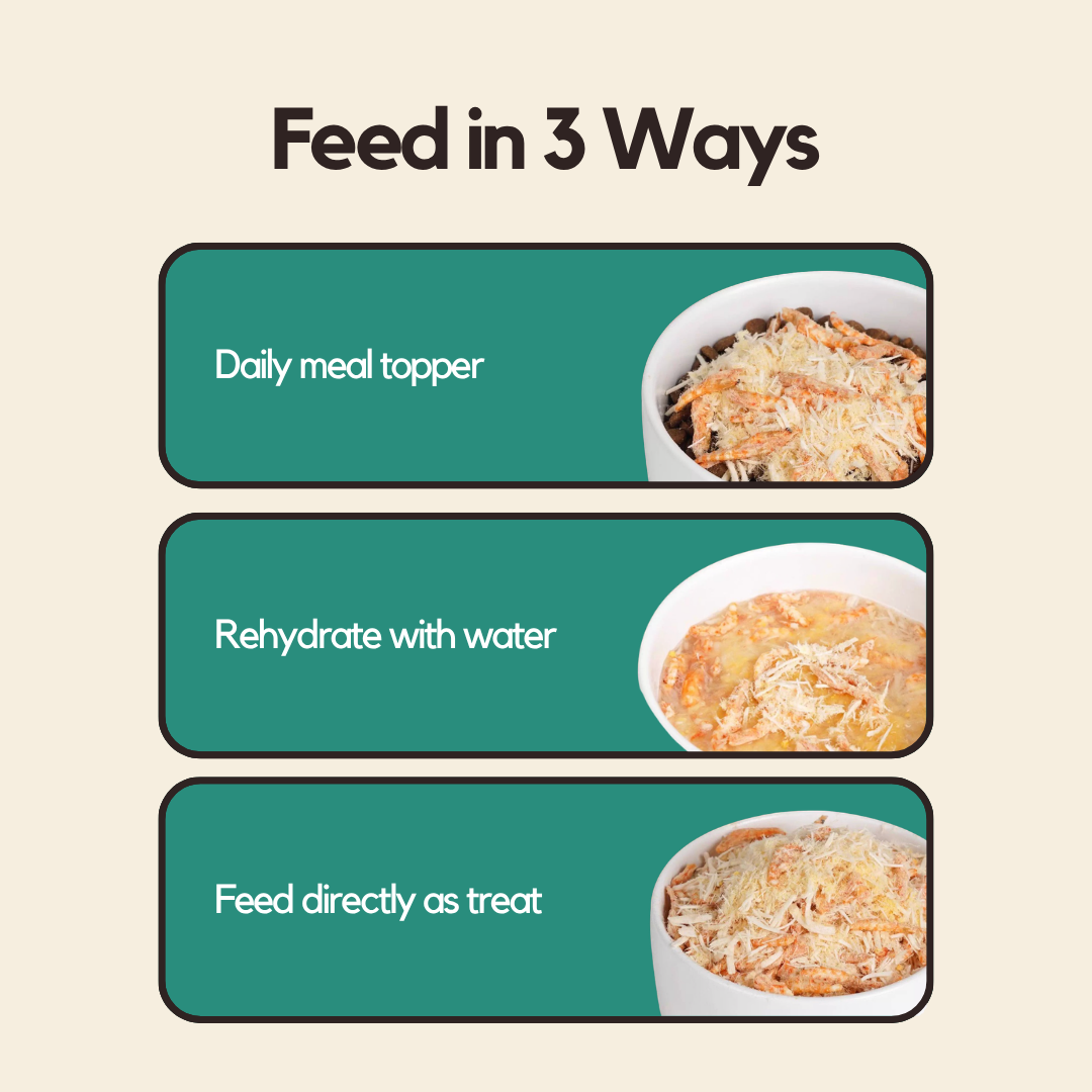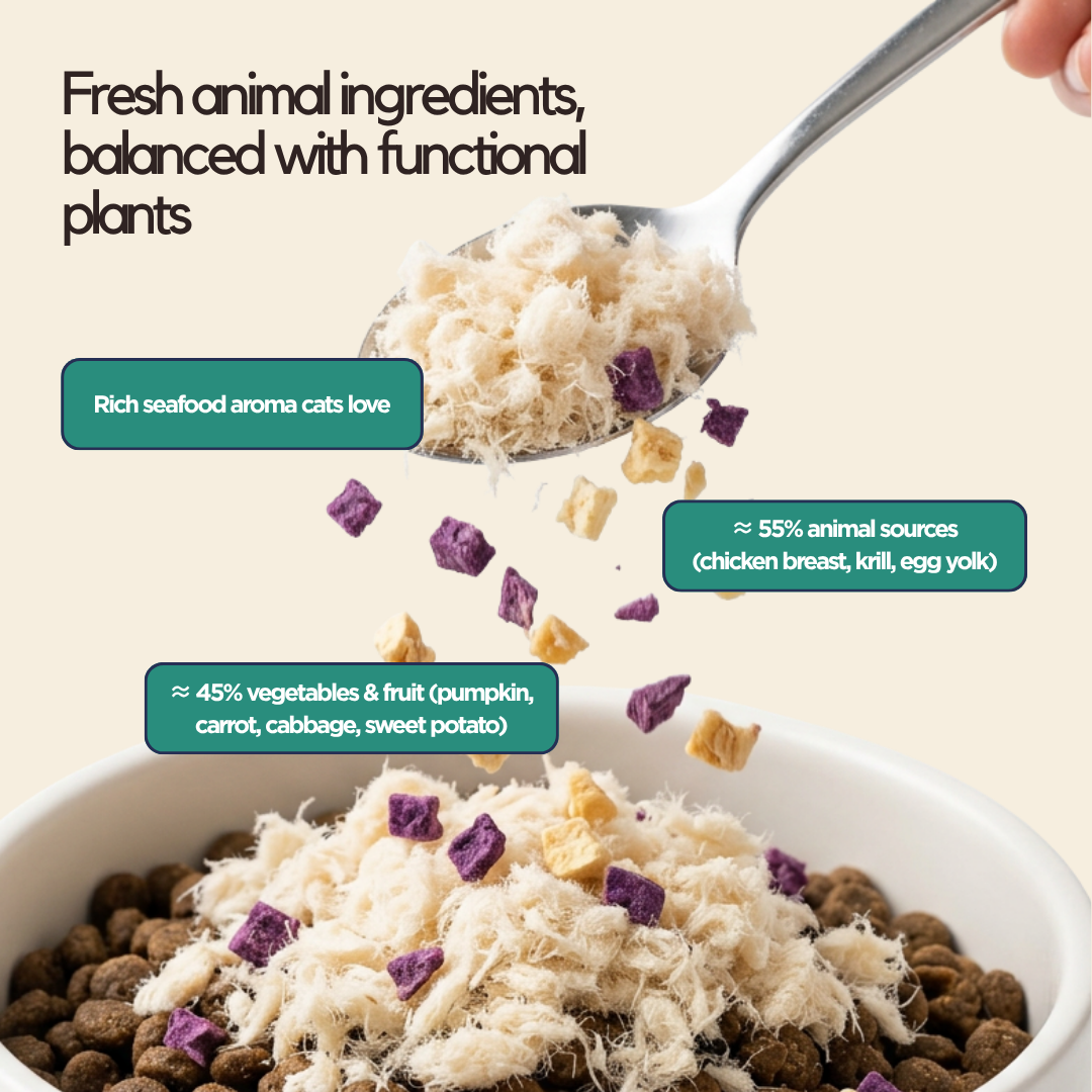 Two toppers, one goal: get your cat eating. The Fruit & Veg variant supports digestion and adds natural sweetness; the Krill & Chicken Floss delivers the kind of seafood aroma cats can't walk away from. Keep both on hand and rotate for variety.